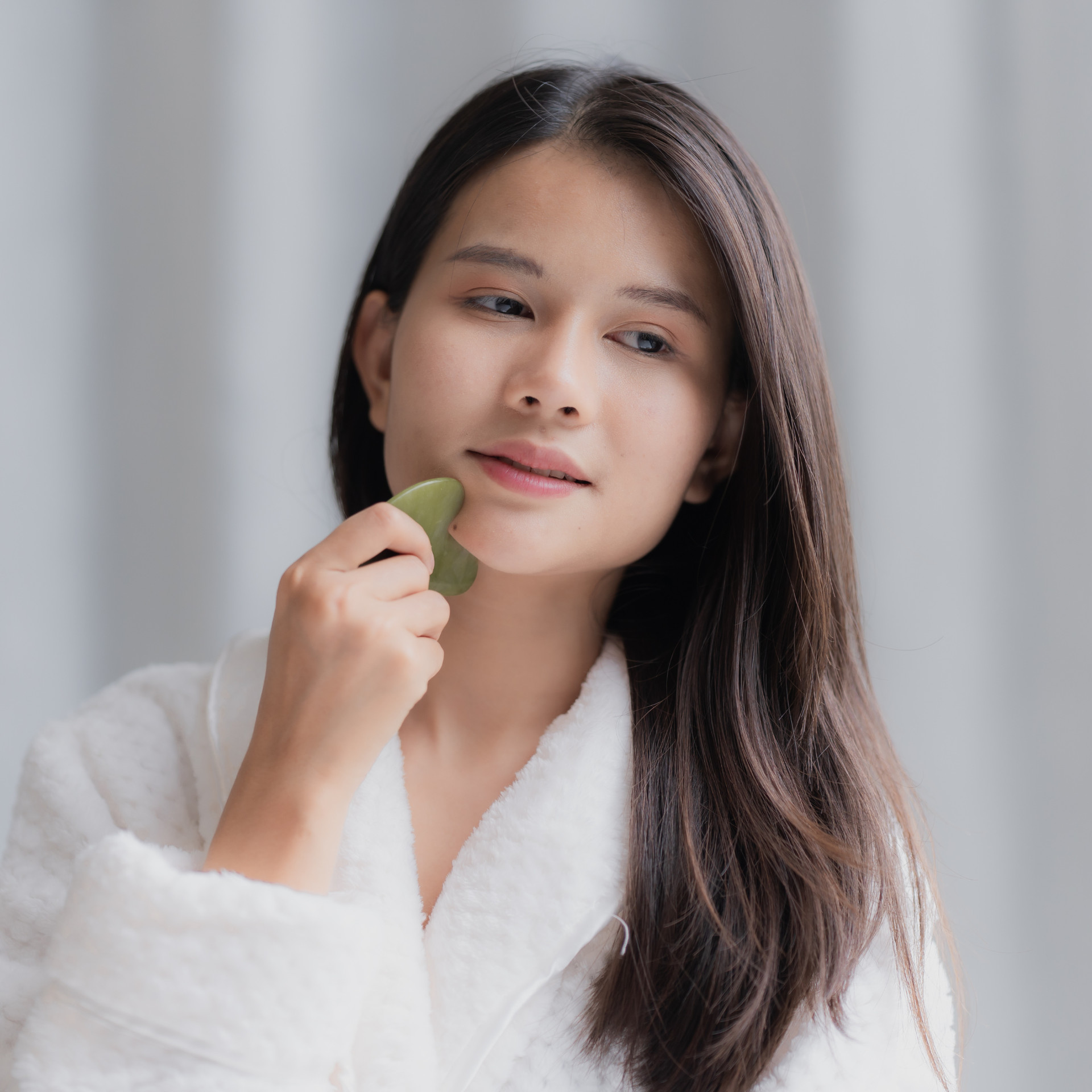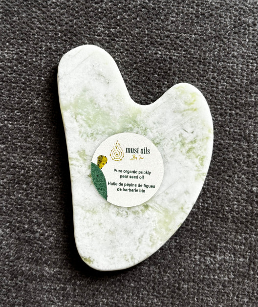 - Glide the Gua Sha from the center of the face outward, using slow and gentle strokes.